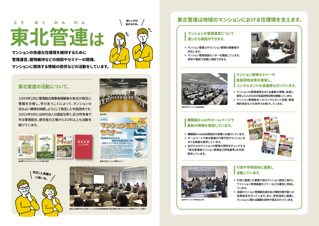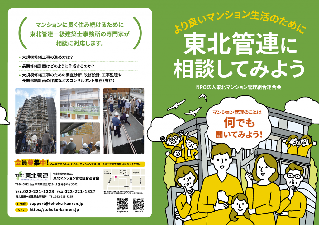 NPO法人 東北マンション管理組合連合会様は、マンションの快適な住環境を維持するために管理運営、建物維持などの相談やセミナーの開催、マンションに関係する情報の提供などの活動されている特定非営利活動法人です。より良いマンション生活のため、長く住み続けるためのアドバイス、大規模修繕工事や長期修繕計画などの作成といった豊富な経験と知識が必要な東北管連一級建築士事務所の専門家が相談に応じてくれる心強い味方。そんな頼れる存在であることを、東北関連様が伝えたい内容と、マンションに住まう方の課題をイメージしながらイラストレーションを用いたビジュアルで表現いたしました。ご依頼くださりありがとうございました。